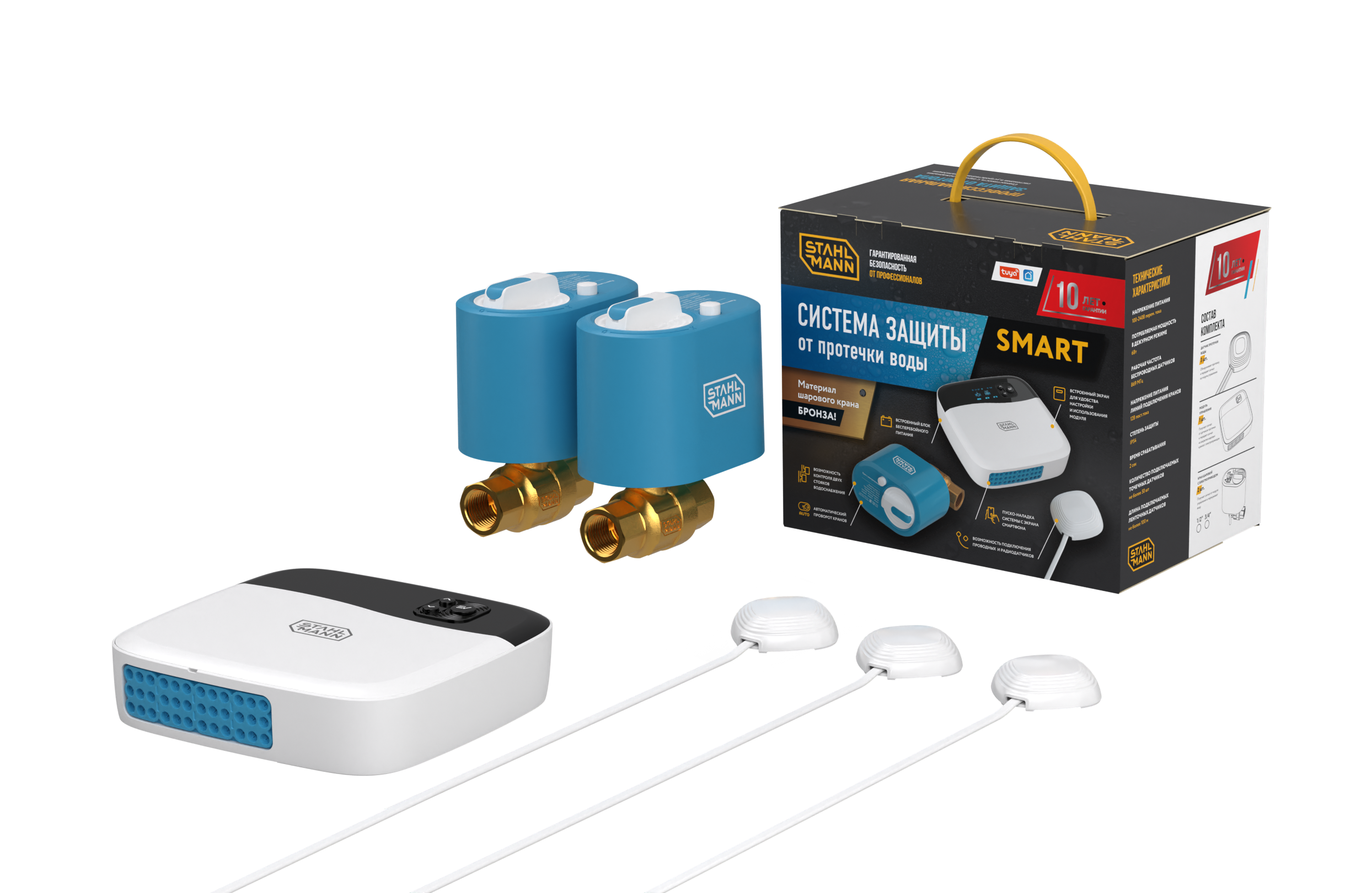 Торговая марка Stahlmann™ включает всё необходимое для безопасности и комфорта в помещениях. Так, системы защиты от протечек воды Stahlmann™ идеально подходят как для бытового, так и для промышленного применения. Базовая модель Base предлагает классическое, проверенное временем решение с усиленным бронзовым краном, устойчивым к коррозии, и модулем, контролирующим обрыв датчиков. Модель Smart представляет собой готовое к использованию «из коробки» умное устройство со встроенным Wi-Fi, блоком бесперебойного питания и возможностью управления через смартфон и голосового помощника. Она позволяет независимо контролировать две зоны, автоматически проворачивает краны для предотвращения закисания и может работать с большим количеством проводных и беспроводных датчиков.