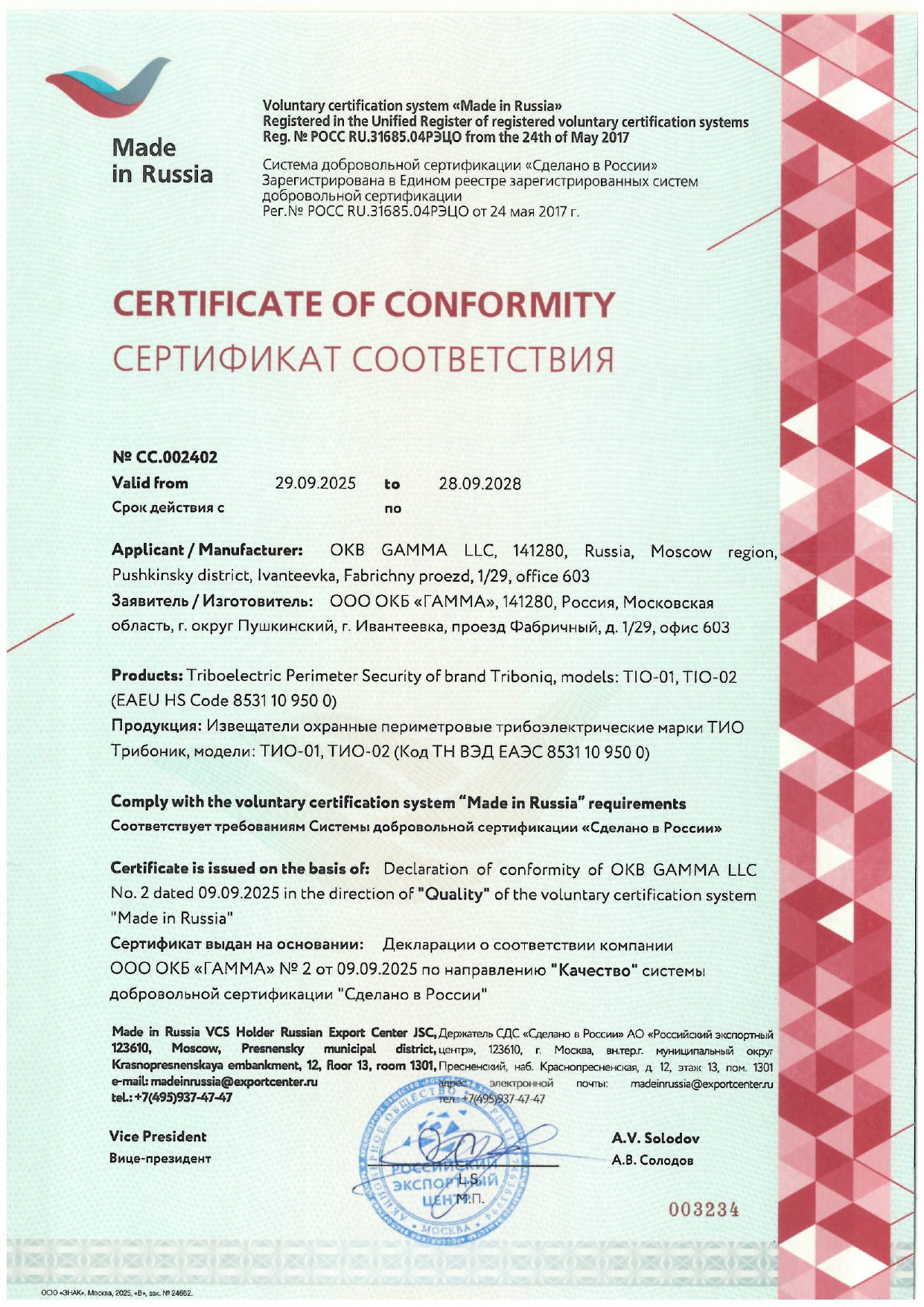 Получение сертификата «Сделано в России» укрепляет позиции Трибоник™ как ведущего российского производителя высокотехнологичных решений в области безопасности, готового к активной работе на международной арене.